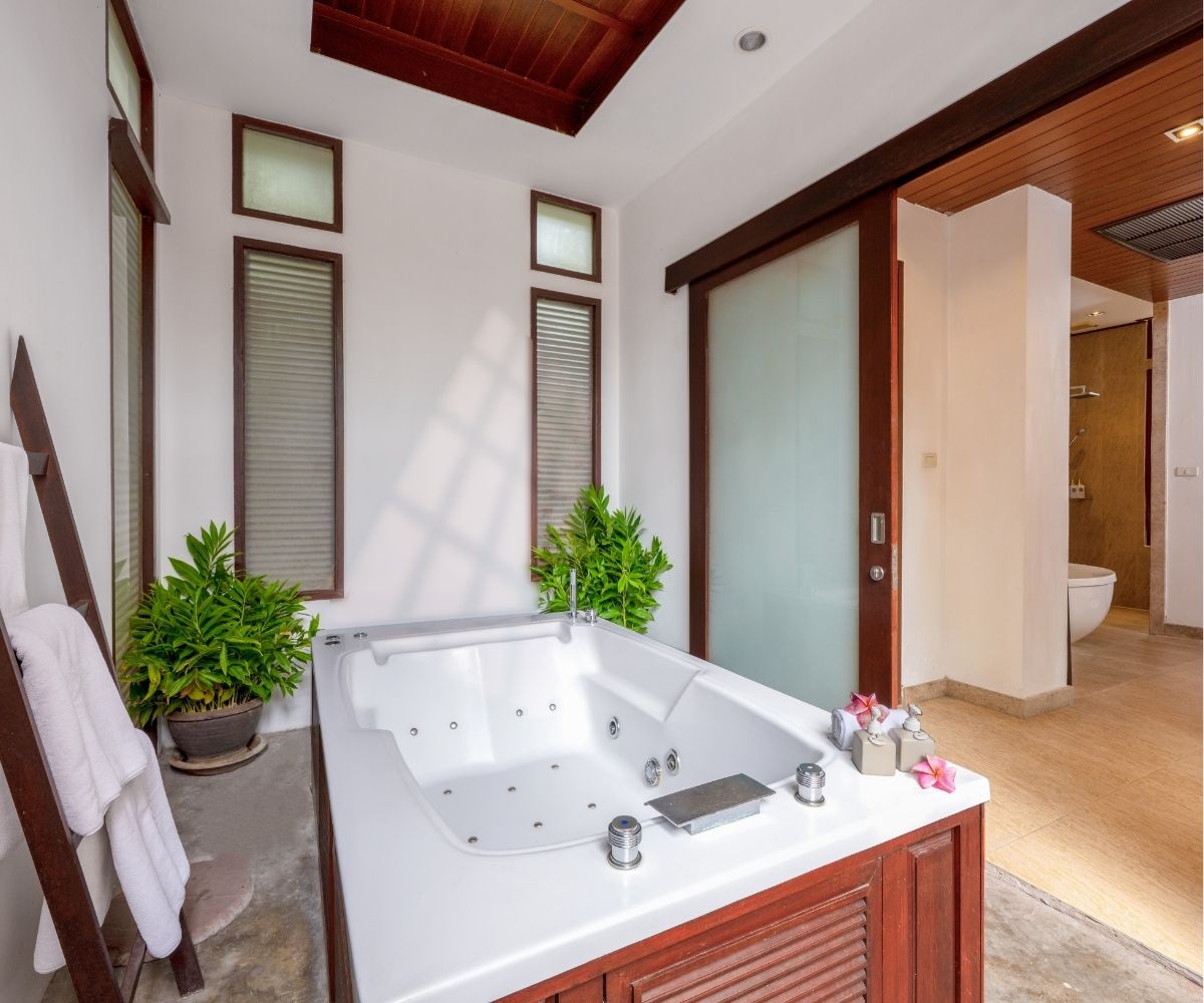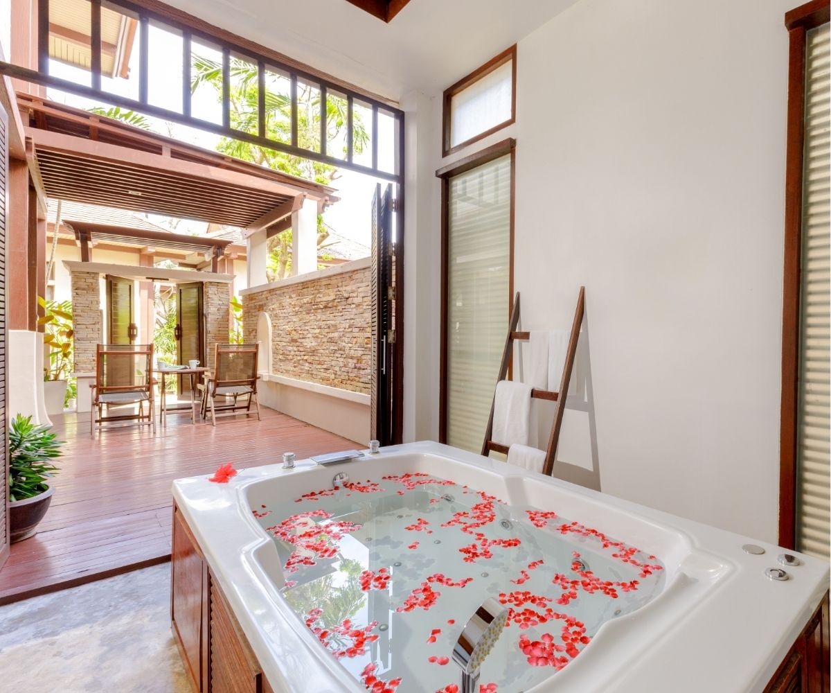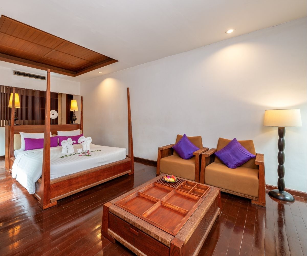 The spacious 77sqm Jacuzzi Suite at The Sarann features a large king bedroom with private outdoor jacuzzi and patio — perfect for unwinding after a day exploring Koh Samui.
