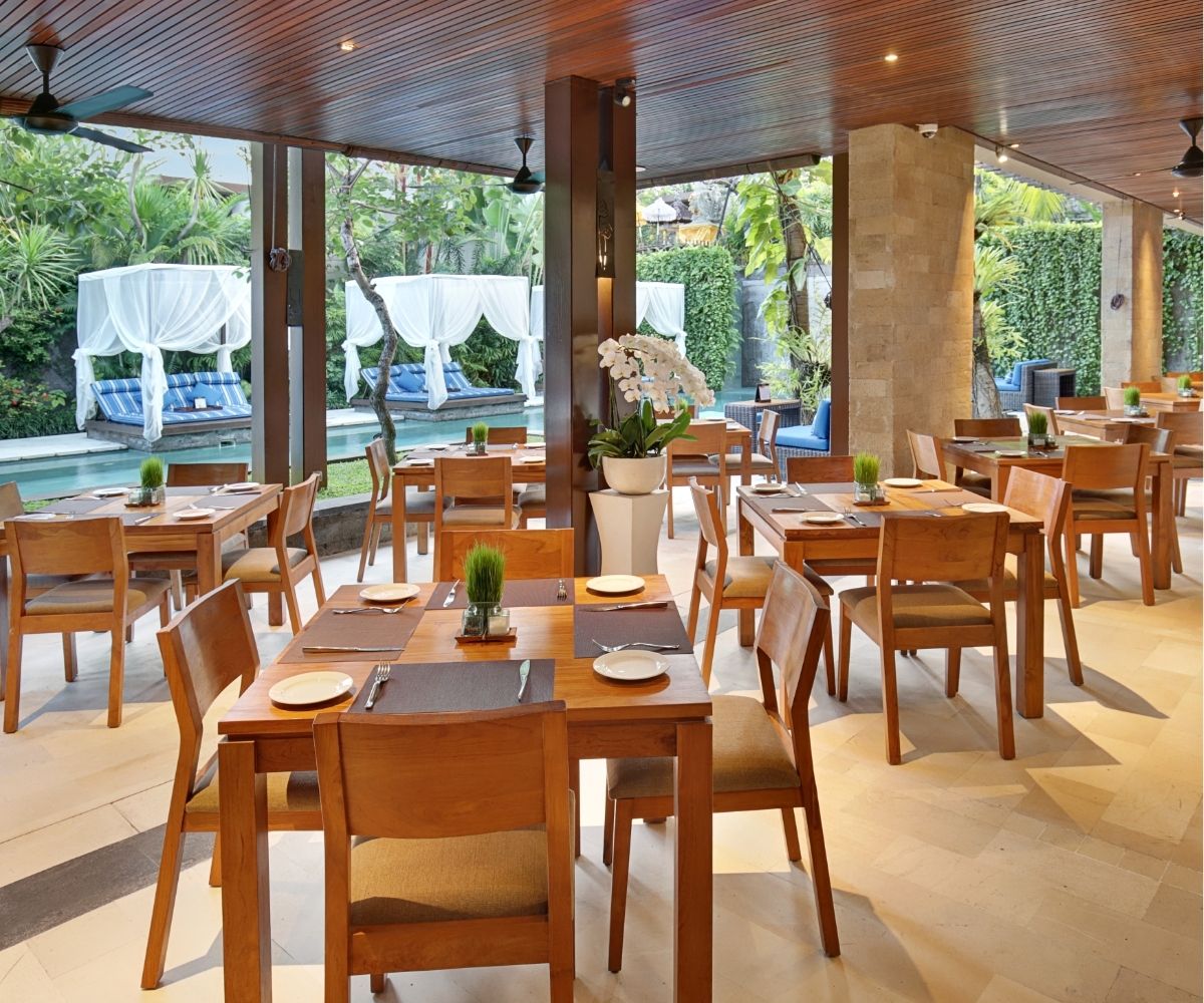 Beyond the villas, unwind by the elegant 25-metre swimming pool or indulge in rejuvenating spa treatments. Dining is centred around Rush Bamboo Restaurant & Bar, serving Indonesian flavours and international favourites in a relaxed poolside setting. Thoughtful extras such as a library, complimentary bicycles and personalised service enhance the resort’s boutique charm.