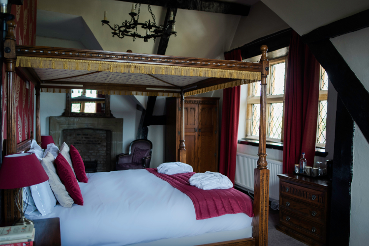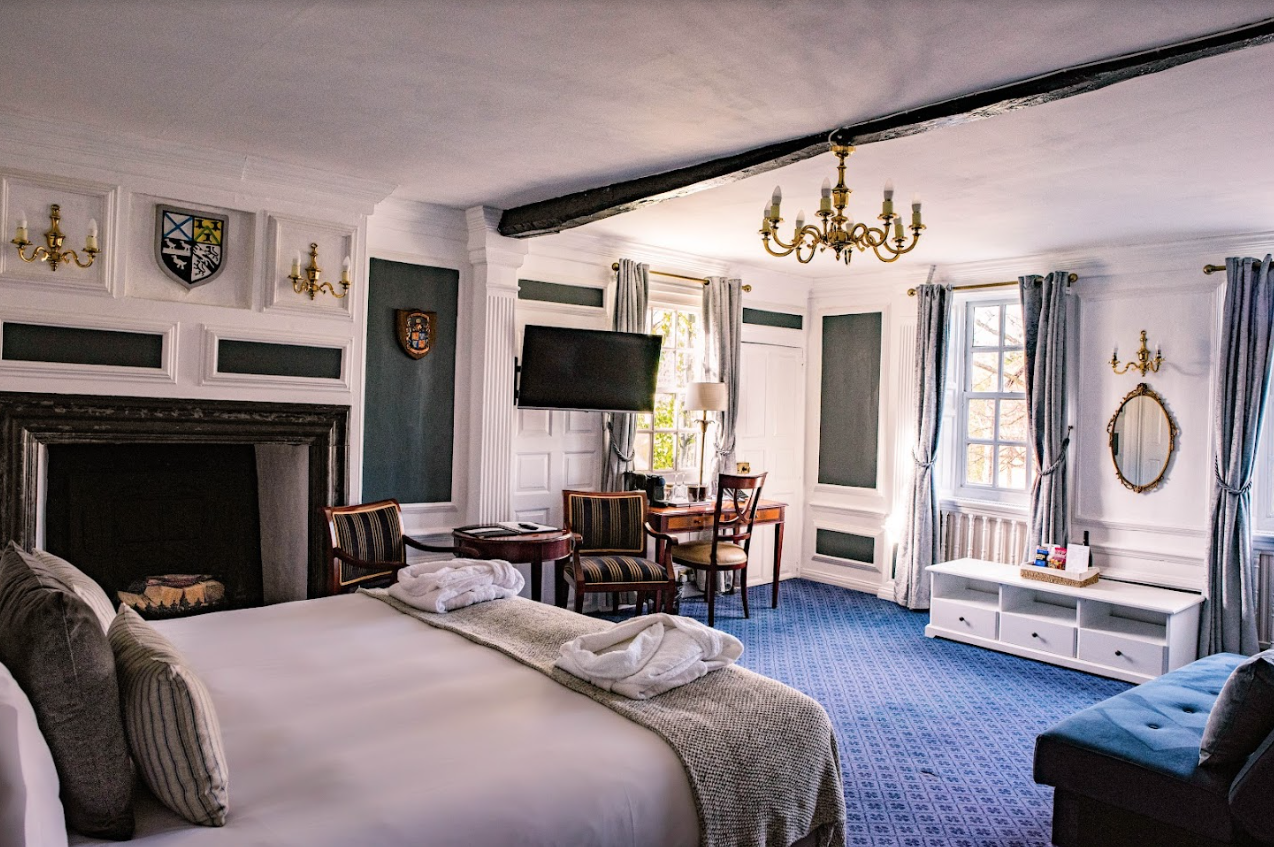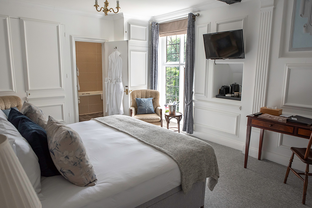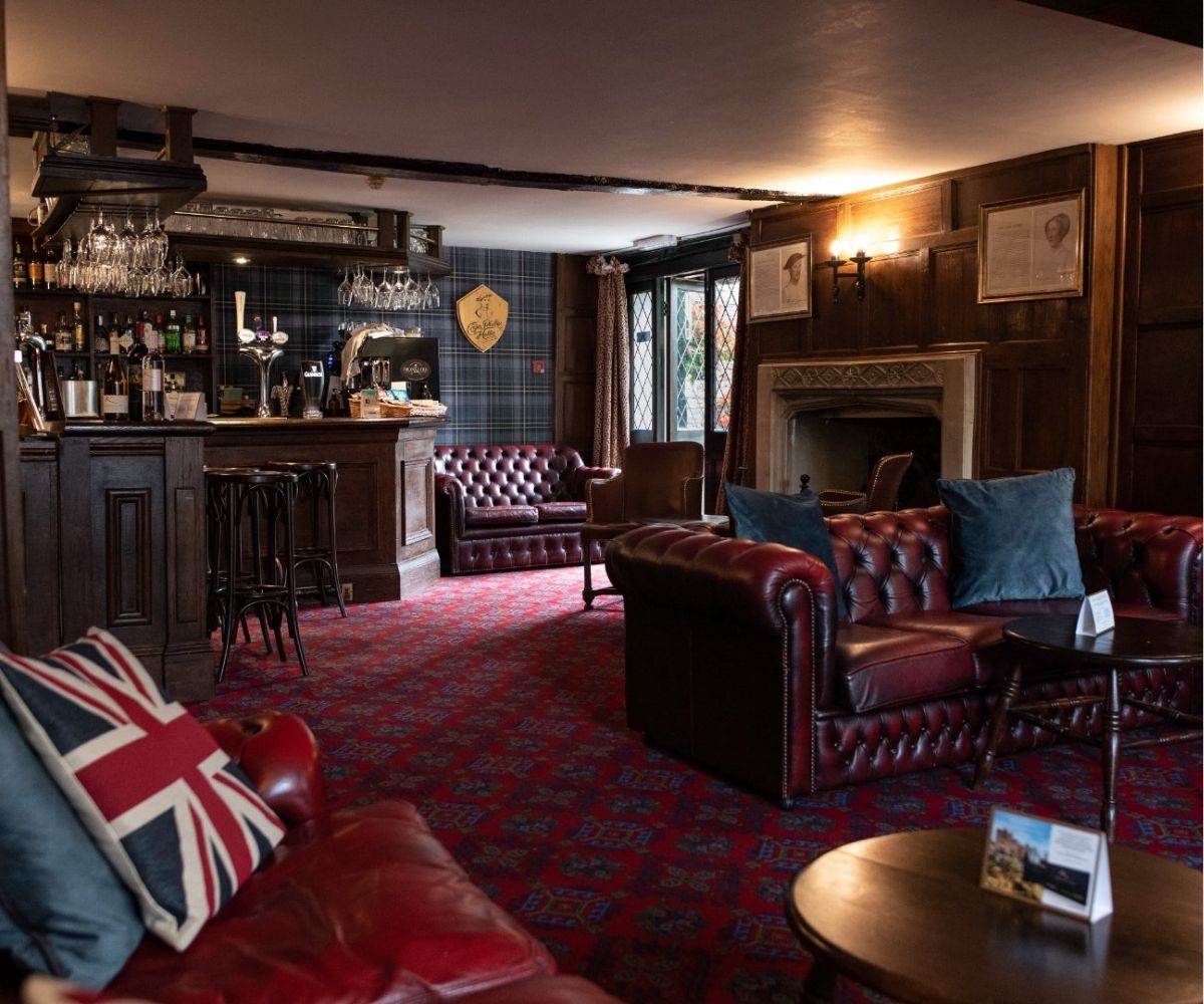 The hotel’s beautifully appointed bedrooms are inspired by the English Arts & Crafts movement, featuring oak furnishings, patterned wallpapers, colourful textiles and crisp cotton linens. Many rooms showcase original Tudor features paired with contemporary en-suite bathrooms, while select rooms are pet-friendly—so even four-legged companions can enjoy a countryside escape.