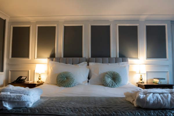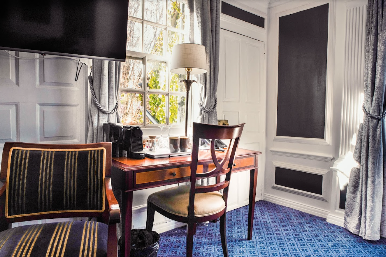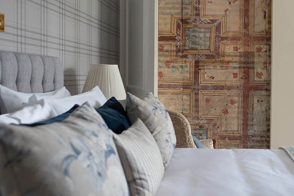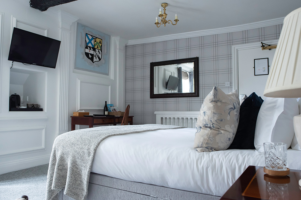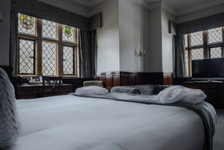 The hotel’s beautifully appointed bedrooms are inspired by the English Arts & Crafts movement, featuring oak furnishings, patterned wallpapers, colourful textiles and crisp cotton linens. Many rooms showcase original Tudor features paired with contemporary en-suite bathrooms, while select rooms are pet-friendly—so even four-legged companions can enjoy a countryside escape.